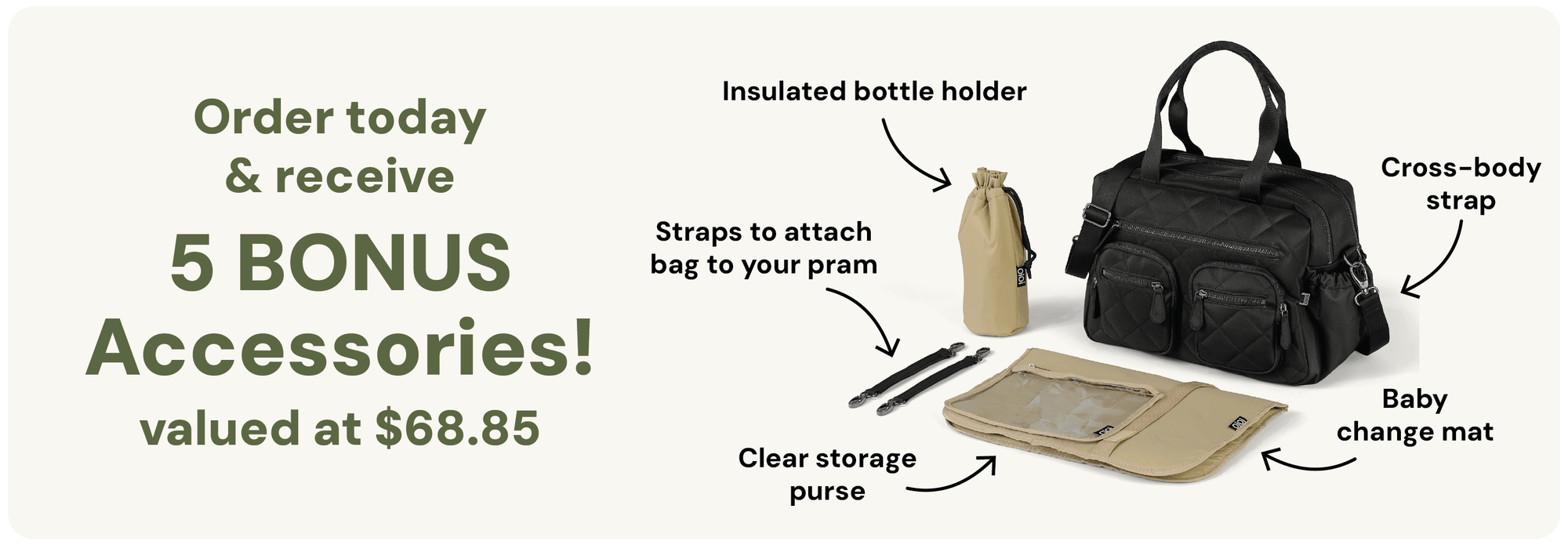 It can be worn over your shoulder, cross-body style with the included messenger strap or be clipped onto your pram using the provided stroller clips.